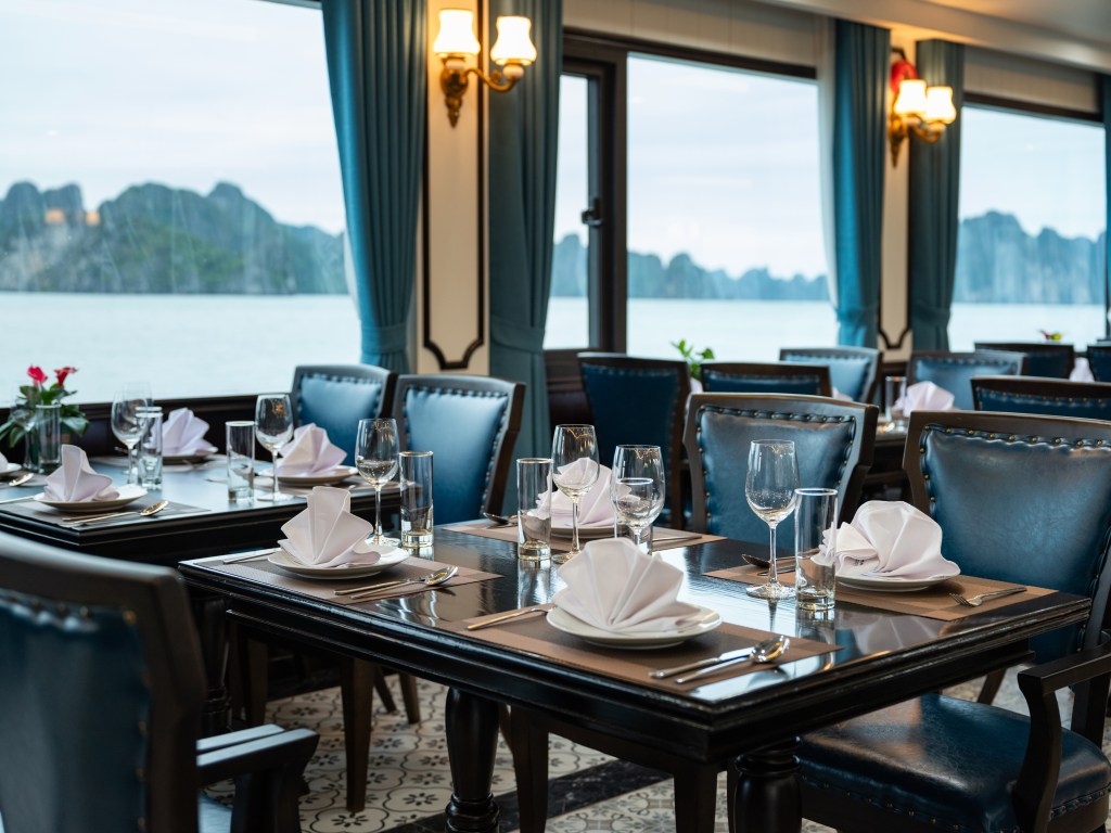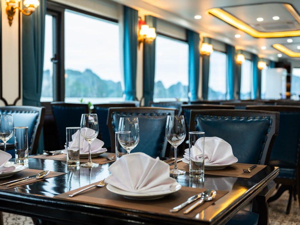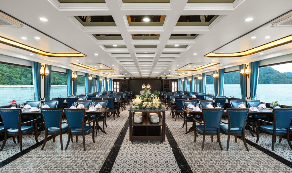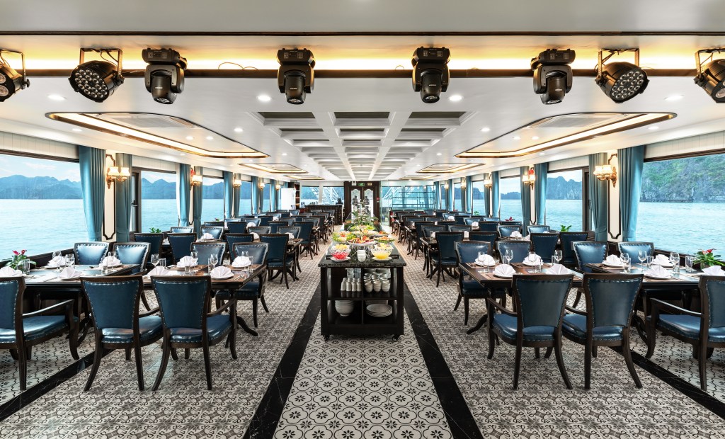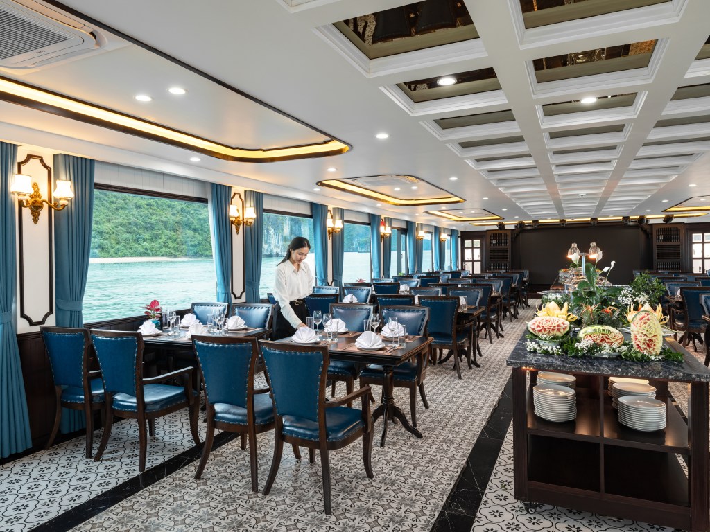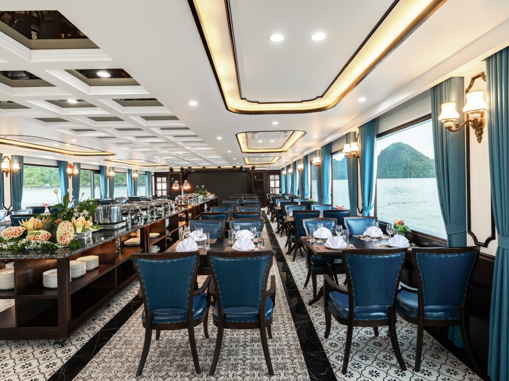 V-Dream được thiết kế thành 3 tầng tinh tế để mang lại trải nghiệm không giới hạn cho du khách. Tầng 1 là nhà hàng sang trọng, nơi bạn có thể thưởng thức những món ngon đa dạng. Sức chứa lên đến 99 người đảm bảo không gian thoải mái cho mọi khách hàng. Bữa trưa tự chọn buffet tại đây được thực hiện bởi đầu bếp lành nghề, đảm bảo sự tươi ngon và đa dạng của món ăn.