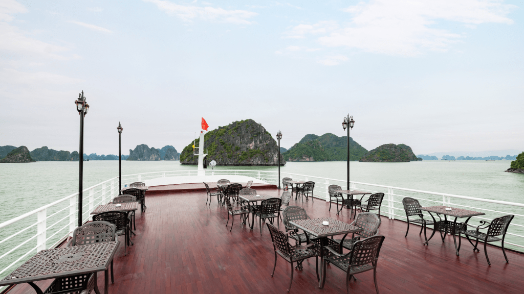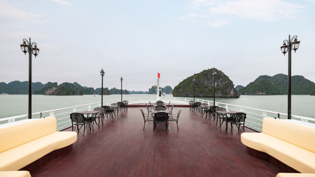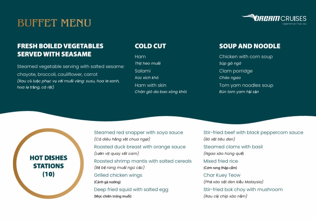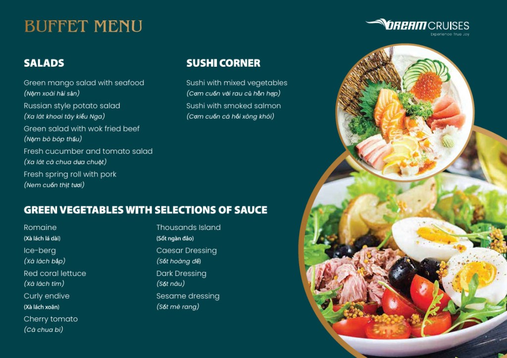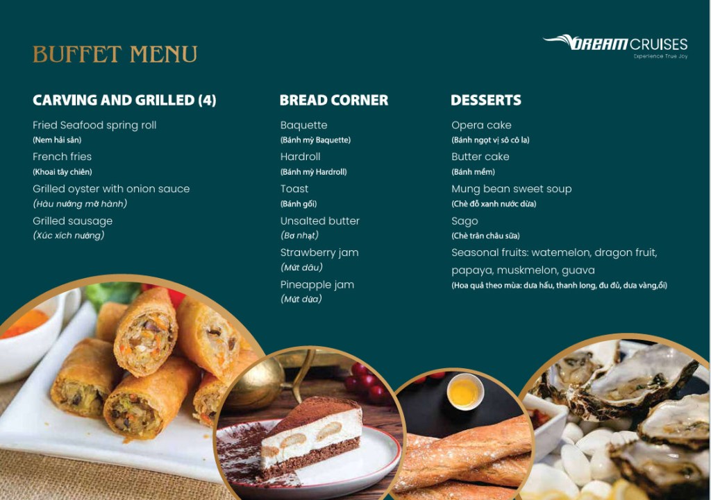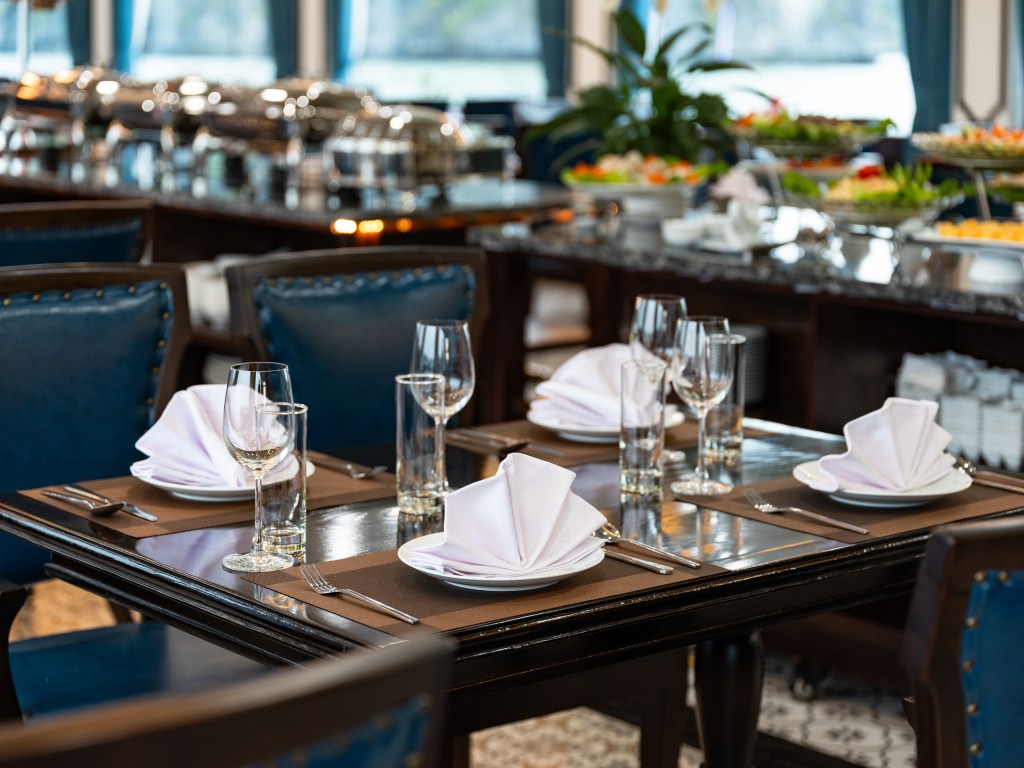 V-Dream được thiết kế thành 3 tầng tinh tế để mang lại trải nghiệm không giới hạn cho du khách. Tầng 1 là nhà hàng sang trọng, nơi bạn có thể thưởng thức những món ngon đa dạng. Sức chứa lên đến 99 người đảm bảo không gian thoải mái cho mọi khách hàng. Bữa trưa tự chọn buffet tại đây được thực hiện bởi đầu bếp lành nghề, đảm bảo sự tươi ngon và đa dạng của món ăn.