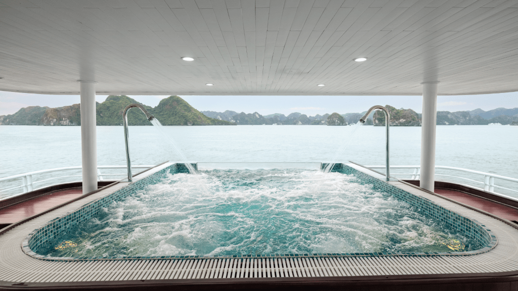 17h00: Quý khách có thể thư giãn trên boong tắm nắng, ngắm hoàng hôn, hoặc tắm bể sục. Cùng lúc quý khách thưởng thức Sunset Party của chúng tôi, bao gồm: Trà, cà phê, trái cây tươi và đồ ăn nhẹ Việt Nam…Tàu di chuyển về Bến